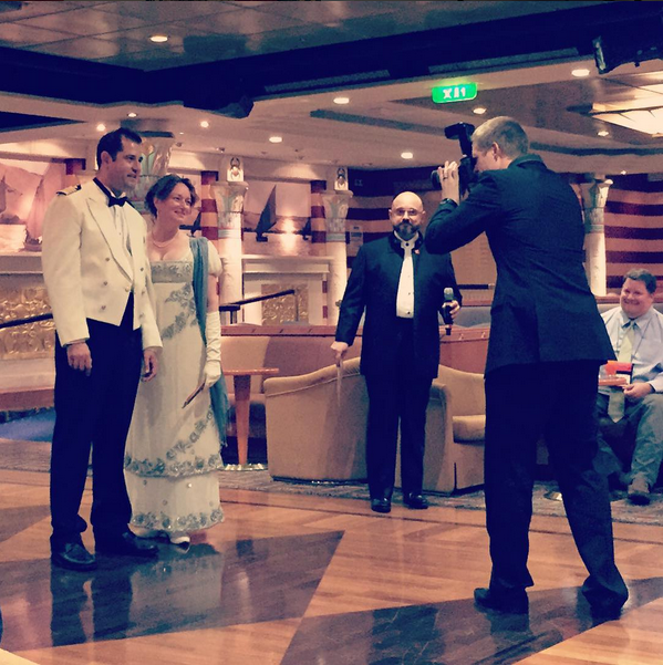 That night was formal night. Actually it was the second formal night of the trip (cruise ships really love the idea of dressing for dinner) but this was the one where we were encouraged to cosplay. I don’t really cosplay, but I do have a fabulous dress covered in skulls, so I thought it was the perfect opportunity to wear it. There was a cocktail party before dinner (free rum punch and champagne, woo!) where I got to gawk at some of the amazing formal costumes of our fellow attendees. I don’t know how you fit a hoop skirt in your suitcase, but some people managed it.